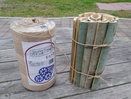 竹割りを終えたら、窯に入れる際に便利なように、手で持てて、自立するくらいの大きさに麻ひもでたばねます。こうすると、窯の中に入れても倒れないので、竹をしっかり並べるときに好都合だからです。