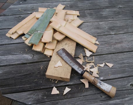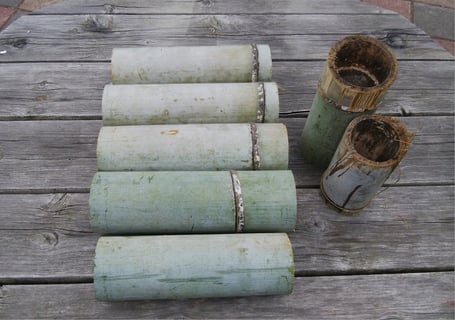 竹割器はいろんな使い方がありますが、このように短く輪切りをした竹の場合は、竹割器の上に竹を置いて木づちでたたく方法が簡単だと思
