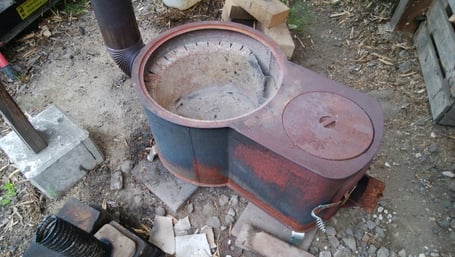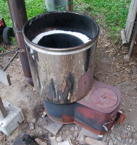 この薪ストーブを使った竹炭づくりでは、ストーブの上に寸胴鍋を乗せますので、写真のように上部が平らになったものでなければいけません。鉄製のものであれば、5千円前後で手に入るはずです。これにエントツを付ければOKで、月2~3回竹炭を作って2年ほどもちます。雨や雪を防ぐ屋根がないと劣化が激しいので注意しましょう。屋根がない所で焼くときは、終わった都度ストーブを屋内に片づけておくようにしましょう。