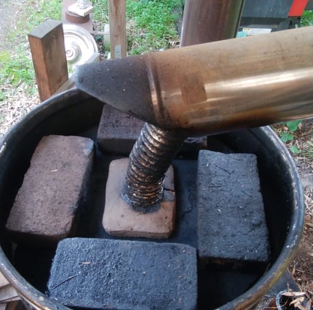 煙の誘導ダクトをセットしたら、フタに重しをします。フタが内部の寸胴鍋の縁としっかり密着しないと、隙間から空気が入り込んで竹炭にならずに燃えて灰になるからです。私は写真のようにレンガを使っていますが、適当な重さがあれば、石やコンクリート板などでもいいでしょう。