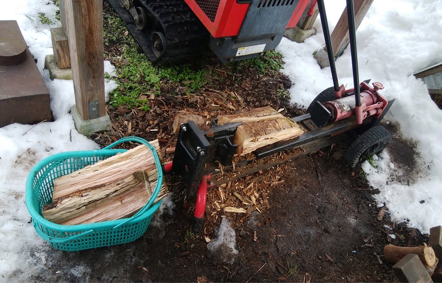 それから、加熱に使う薪は、いつものことながら、製炭作業の合間に薪割り機で作ります😅
