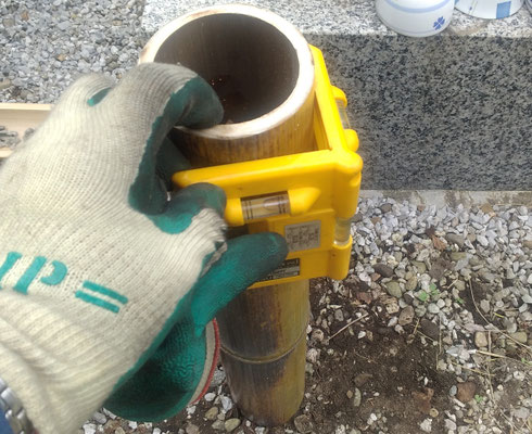 写真の黄色いグッズは、柱を立てる際に鉛直になっているかどうかが一目で分かるもので、これは便利です。竹や単管パイプのような丸いものにも使えます。