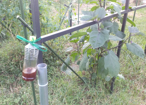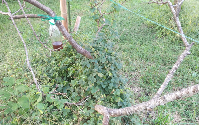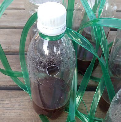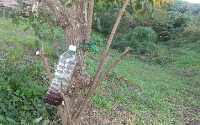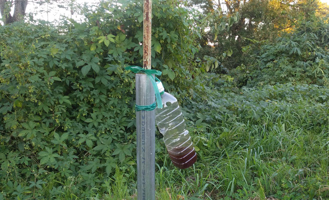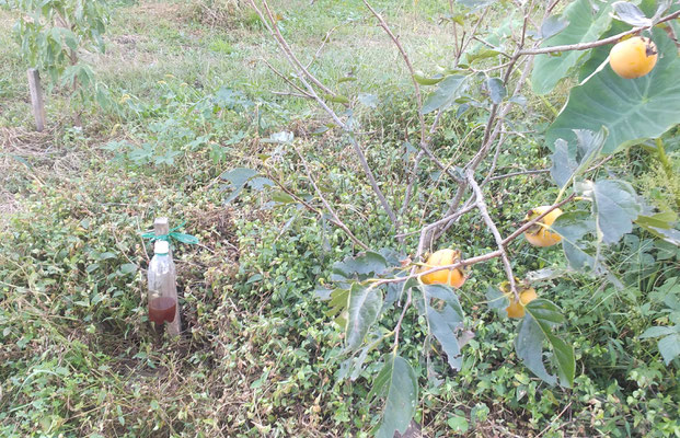 そこで、自分でやれる熊対策の一環として作った竹酢液+唐辛子の液体を急いでペットボトルに入れ、家の周りに10本ぶら下げました。