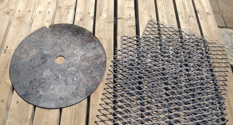 ちなみに、エキスパンドメタルを円形に切断するのに、ディスクグラインダーとニプラを使ってみました。どちらもうまくいきましたが、グラインダーの方は激しく火花が出て、時々手にそれが当たって熱かったので、二プラの方がいいみたいでした。
