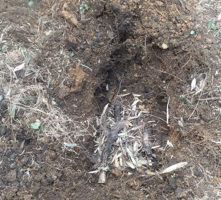 そして、今回は、掘った後に土の減少を防ぐために、枯れた地下茎を投入してみました。