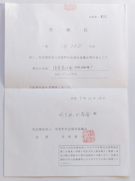 つまりは、この寄付は私のお金ではなくお客さんのお金なので、「匿名」での寄付にはせず、屋号の「やってみっか奔舎」の名前で行っています。