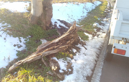 以前、強風のため幹の中ほどから折れたのですが、その残骸が再度の強風で倒れたものです。