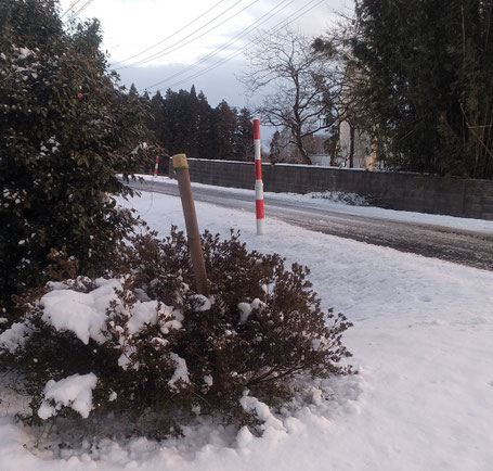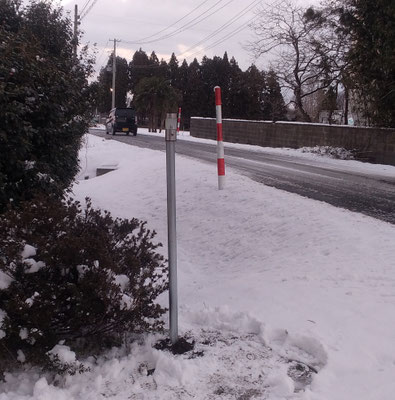 雪が大量に積もると進入路の入口が分かりにくくなるので、10年ほど前に立てたもので、先端にはソーラーライトが付いています。これは、夜間に威力を発します。
