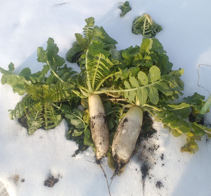 今日(1/15)は、少し雪が融けたので大根畑に行ってみたところ、葉っぱが雪の上に出ていました。