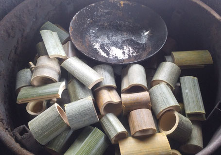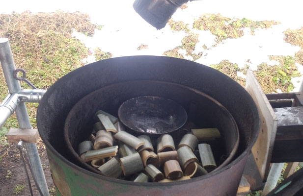 窯の中にある皿は、竹酢液を採るための煙突から液体化した竹の成分が垂れてくるので、それを受け止めるためのものです。