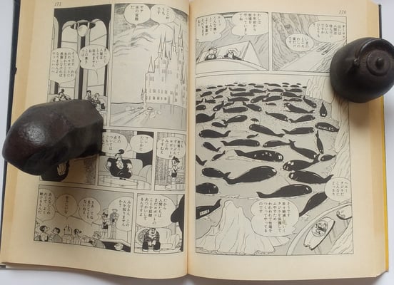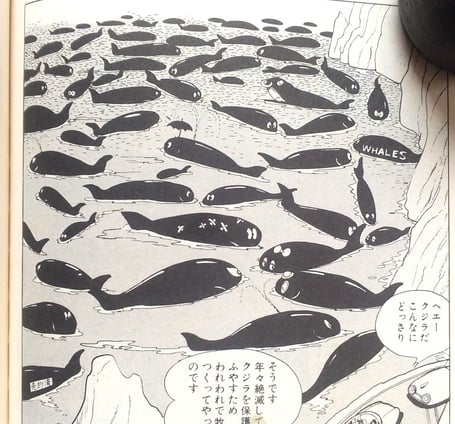 それから、このコマにはたくさんのクジラが書いてあるのですが、よく見ると、それぞれの表情が違います。